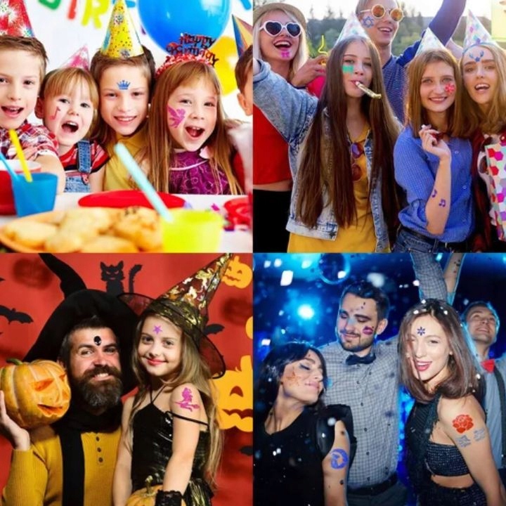 WAŻNE – Nie wymagają kleju – aplikacja odbywa się za pomocą kolorowych naklejek transferowych, które utrzymują się na skórze przez wiele godzin.