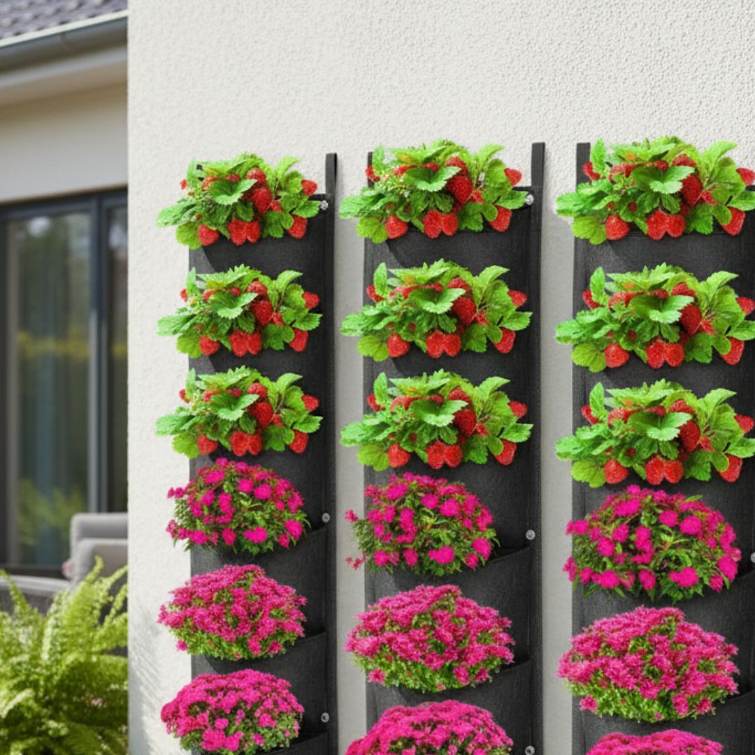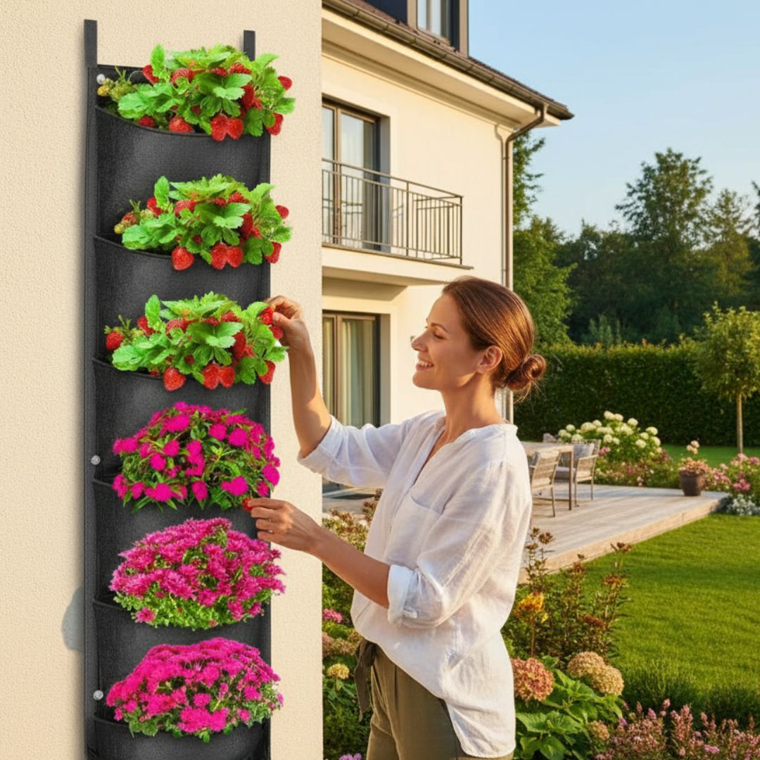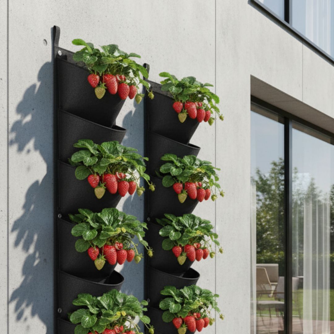 Planter pozwala wygodnie uprawiać zioła, kwiaty ozdobne, rośliny zwisające oraz małe odmiany truskawek. Kaskadowy układ kieszeni sprawia, że rośliny mają odpowiednią przestrzeń do wzrostu, a jednocześnie całość prezentuje się bardzo estetycznie i dekoracyjnie.