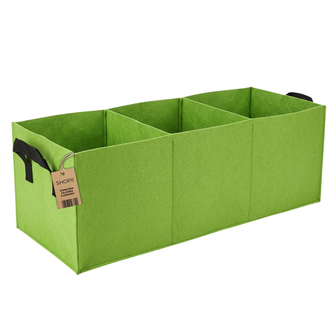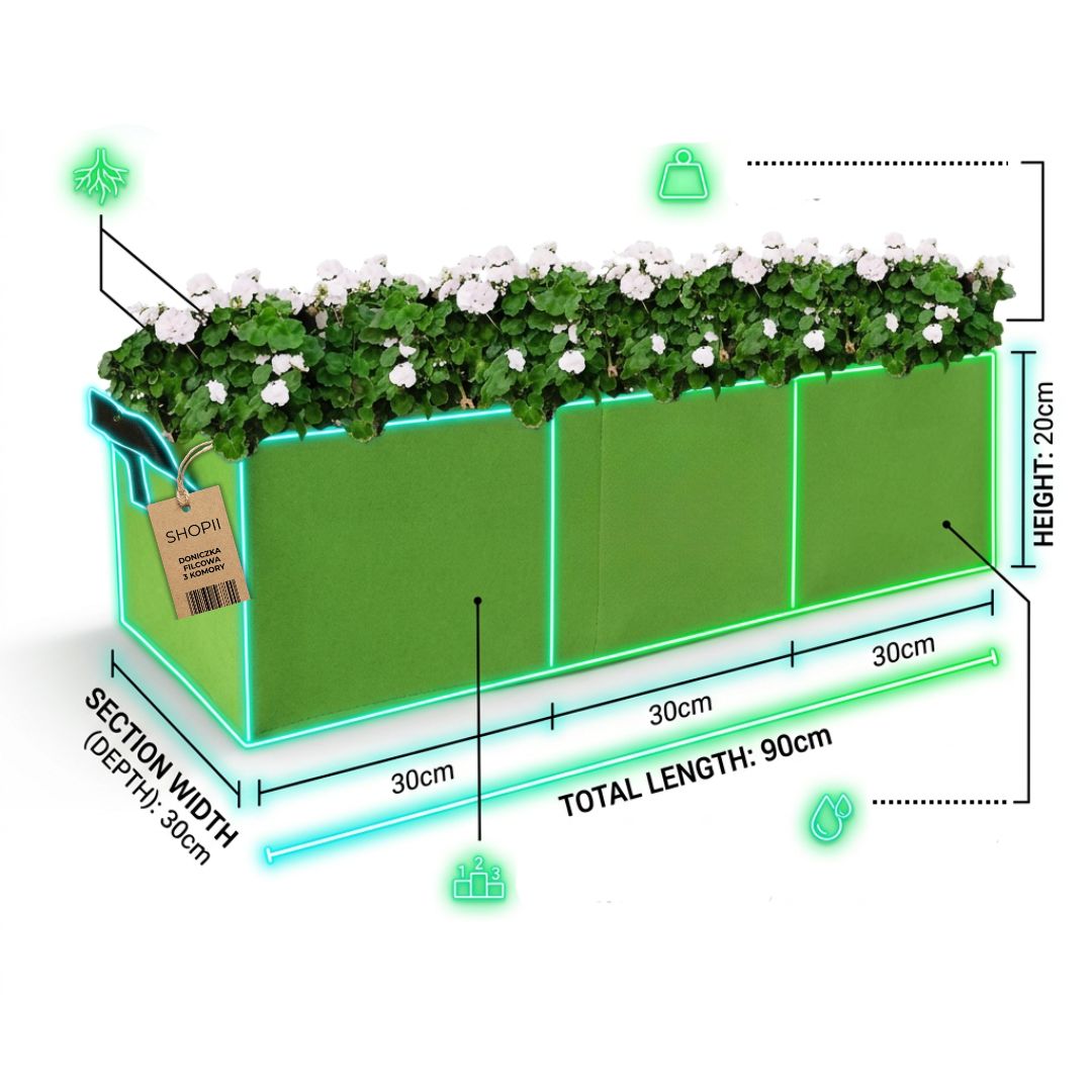 Doniczka o wymiarach 90 x 30 cm została wyposażona w 3 oddzielne komory, co umożliwia jednoczesną uprawę różnych roślin. To wygodne rozwiązanie pozwala maksymalnie wykorzystać dostępną przestrzeń.