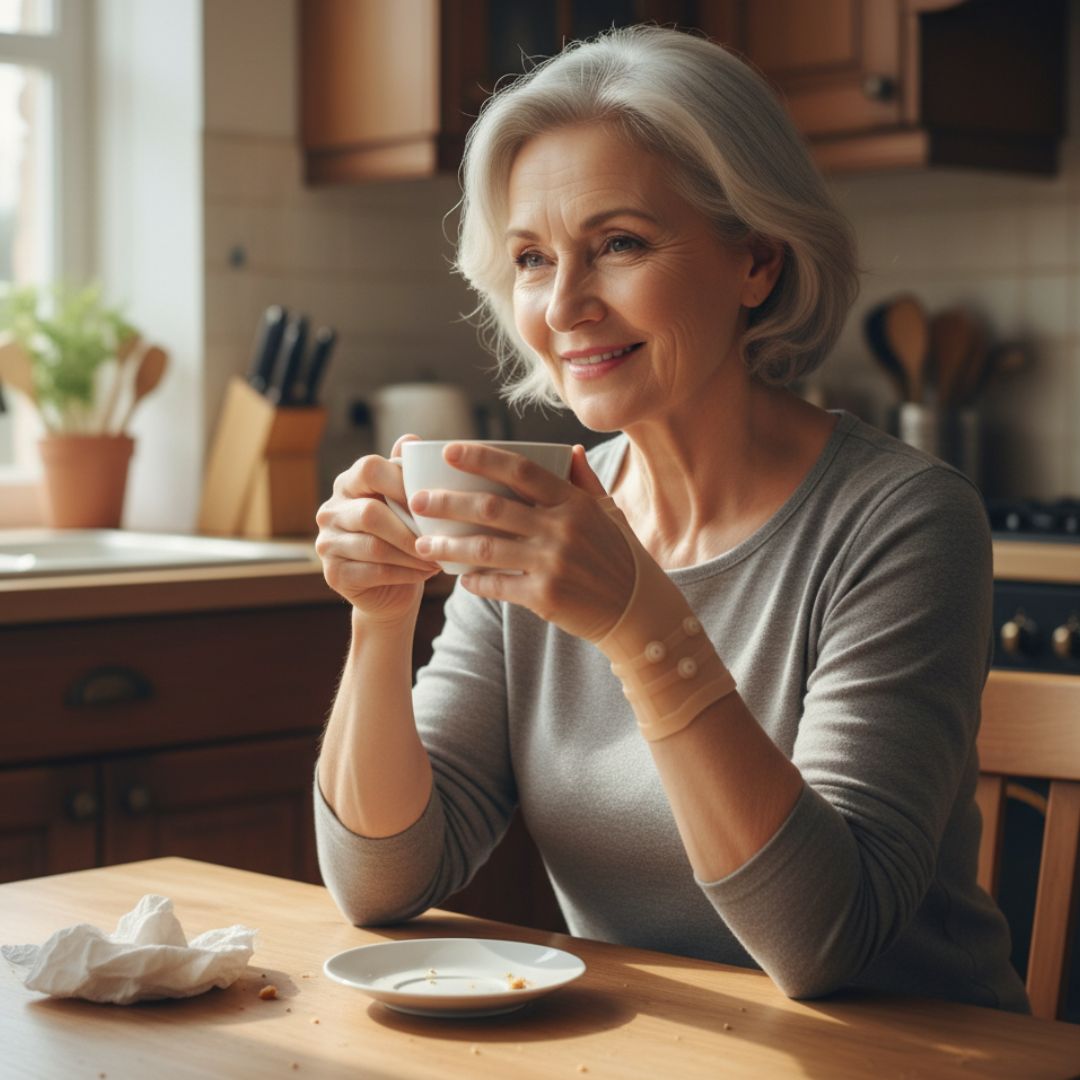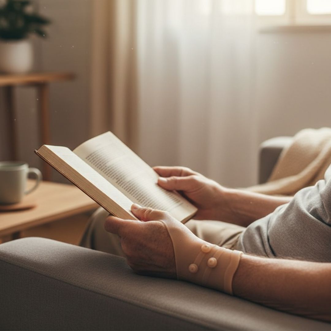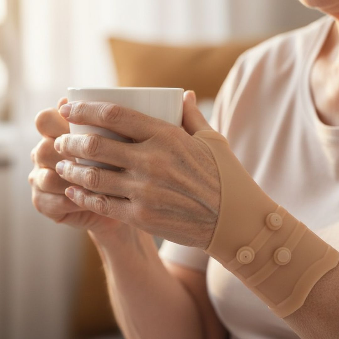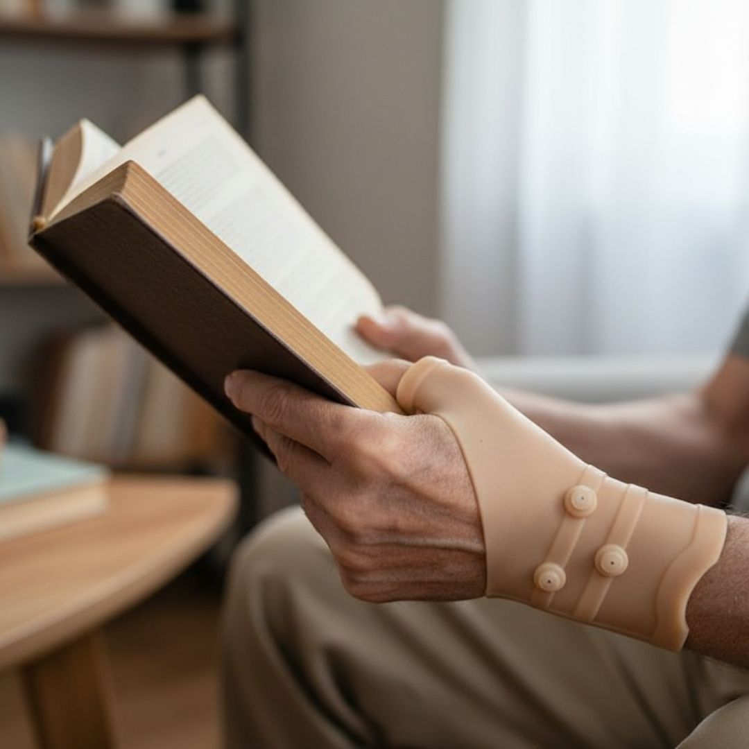 Stabilizator dopasowuje się do nadgarstka i nasady kciuka, wspierając stawy podczas pracy, treningu lub odpoczynku. To codzienne wsparcie w walce z dyskomfortem.