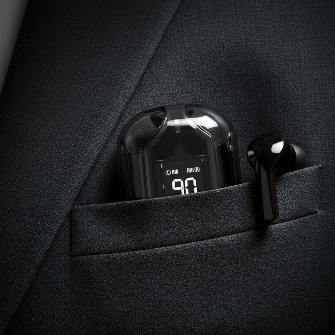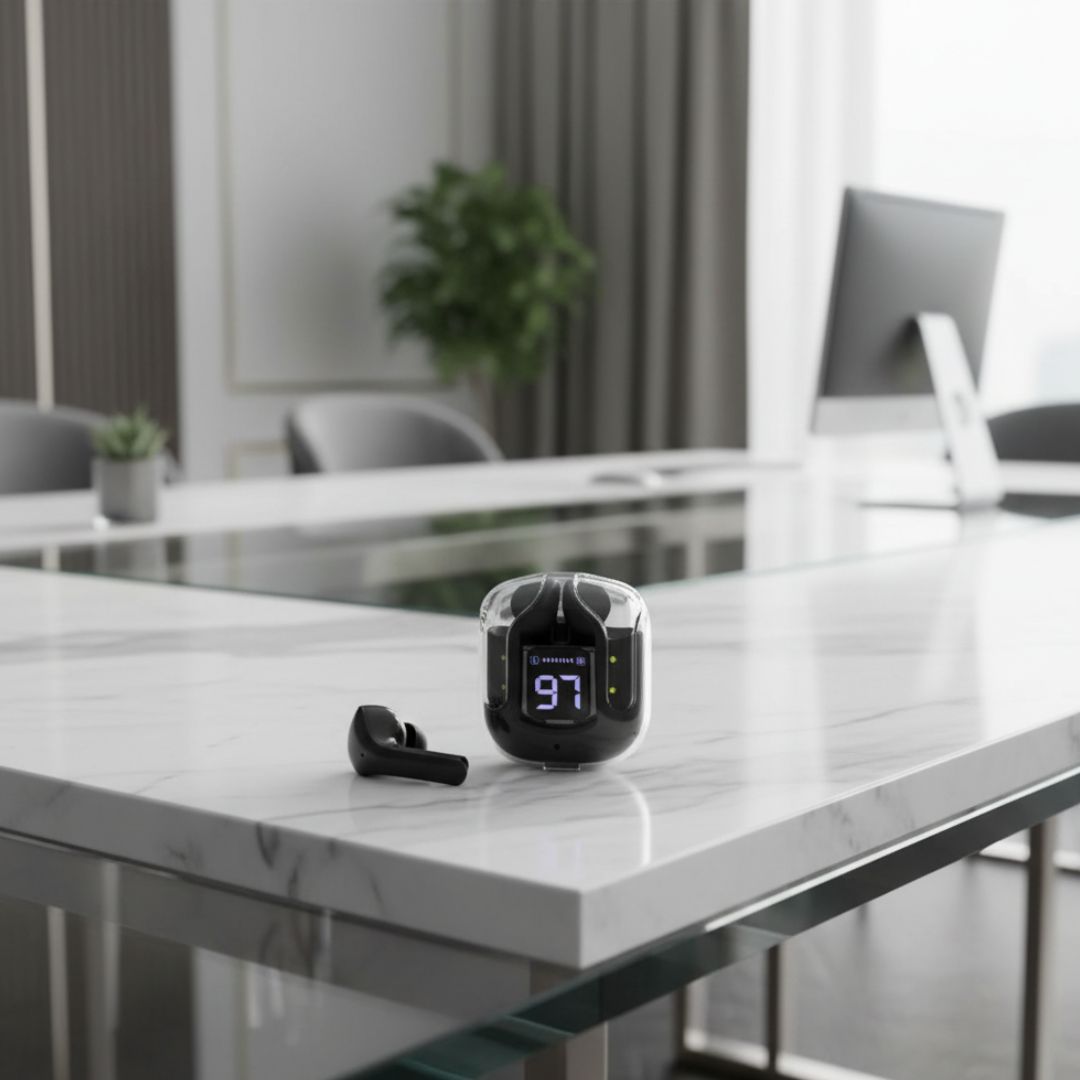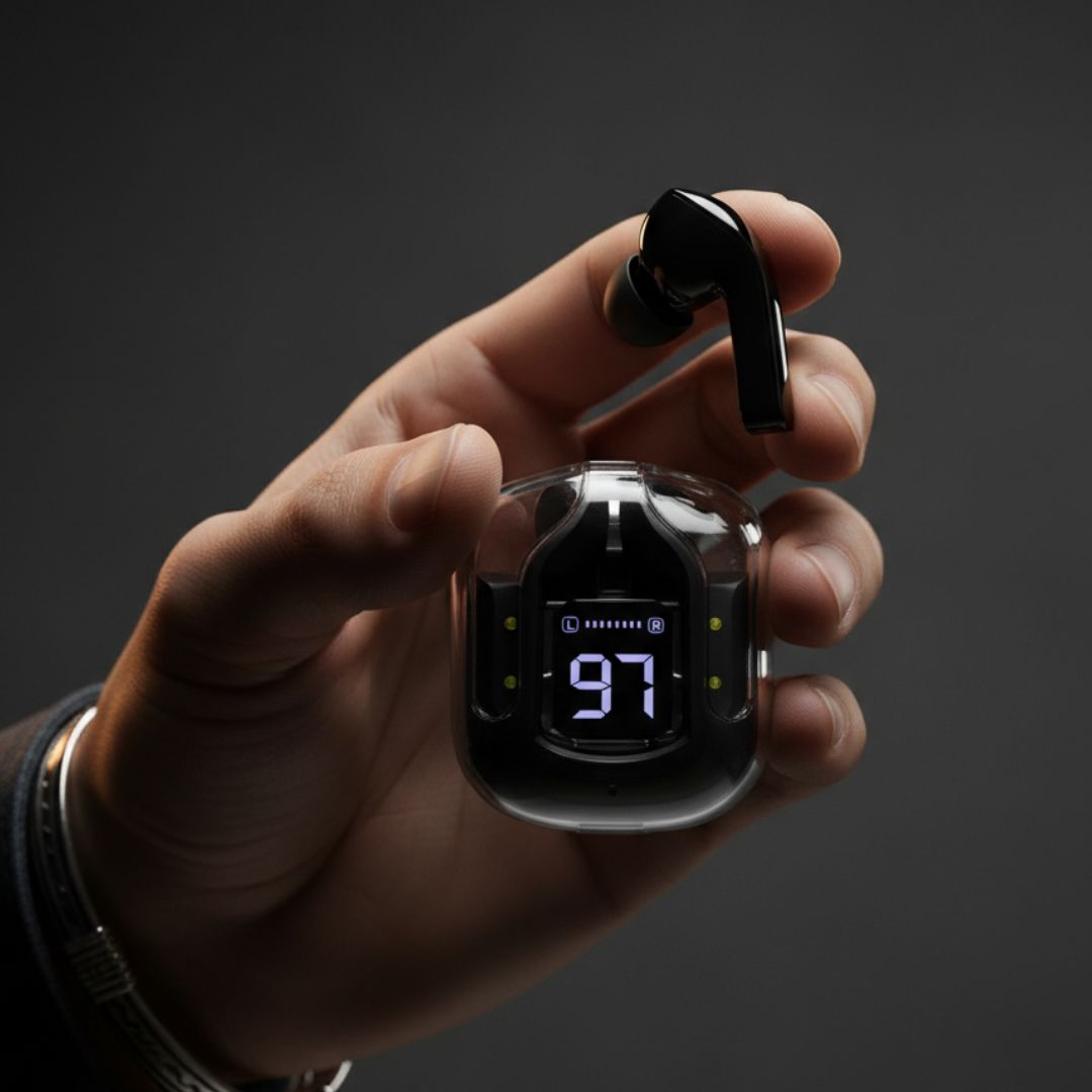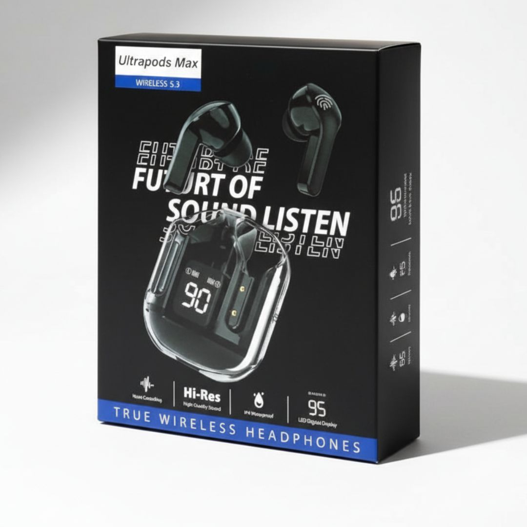 ULTRAPODS MAX to bezprzewodowe słuchawki douszne stworzone dla osób ceniących nowoczesny styl i dopracowane detale. Przezroczysta obudowa nadaje słuchawkom unikalny, futurystyczny charakter, wyróżniając je wśród innych modeli. To nie tylko sprzęt audio – to element wizerunku, który podkreśla indywidualność użytkownika.